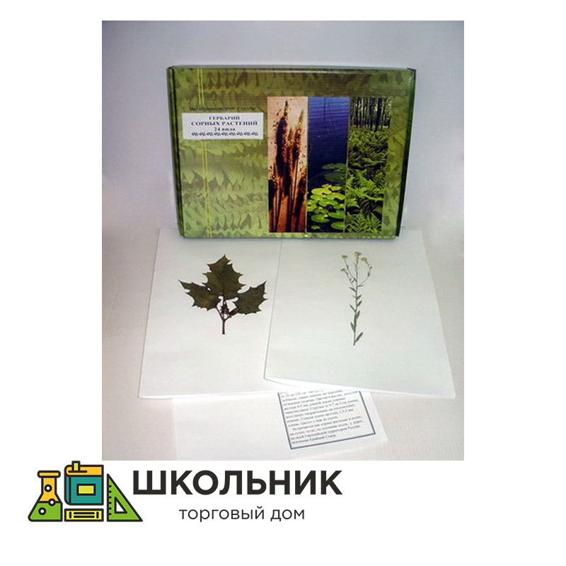 В гербарии представлены 24 вида наиболее распространенных сорных растений, произрастающих в различных географических зонах России: от Сибири до южных районов. Засушенные растения (некоторые с соцветиями и плодами) наклеиваются на гербарные листы (формат А3). К гербарию прилагается список с наименованием растений. В этикетках на гербарных листах даны краткие описания растений.