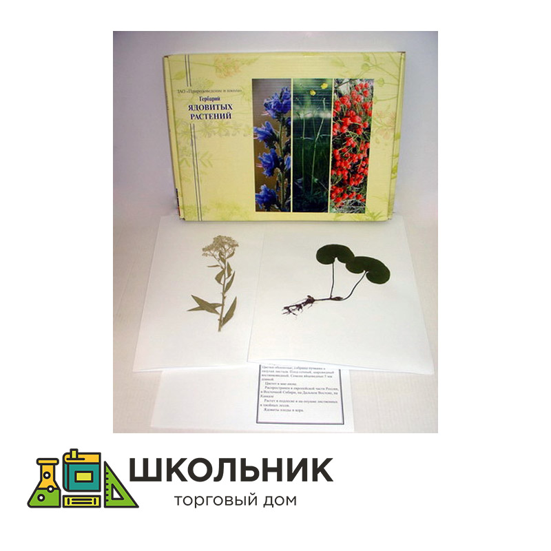 В гербарии представлены 20 наименований наиболее распространенных и известных растений, которые являются ядовитыми и в то же время имеют лекарственное значение. Список растений прилагается. Каждое засушенное растение наклеено на гербарный лист (формат А3), на котором обозначено наименование растения и дано краткое описание. Изделие упаковано в коробку с маркировкой.