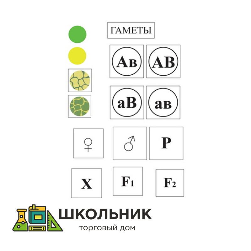Пособие состоит из набора 92 карточек с изображениями, напечатанных на картоне и ламинированных матовой пленкой. На карточках представлено изображение условного обозначения генотипов, гамет и прочими специальными символами, а также карточек символически изображающих семена гороха. В методических рекомендациях приведены схемы, позволяющие наглядно продемонстрировать третий закон Менделя (закон независимого наследования признаков). К набору прилагается комплект магнитов, с помощью которых карточки могут крепиться на магнитной доске, для этого нужно наклеить магнитную резину, предварительно сняв с неё защитную плёнку.
