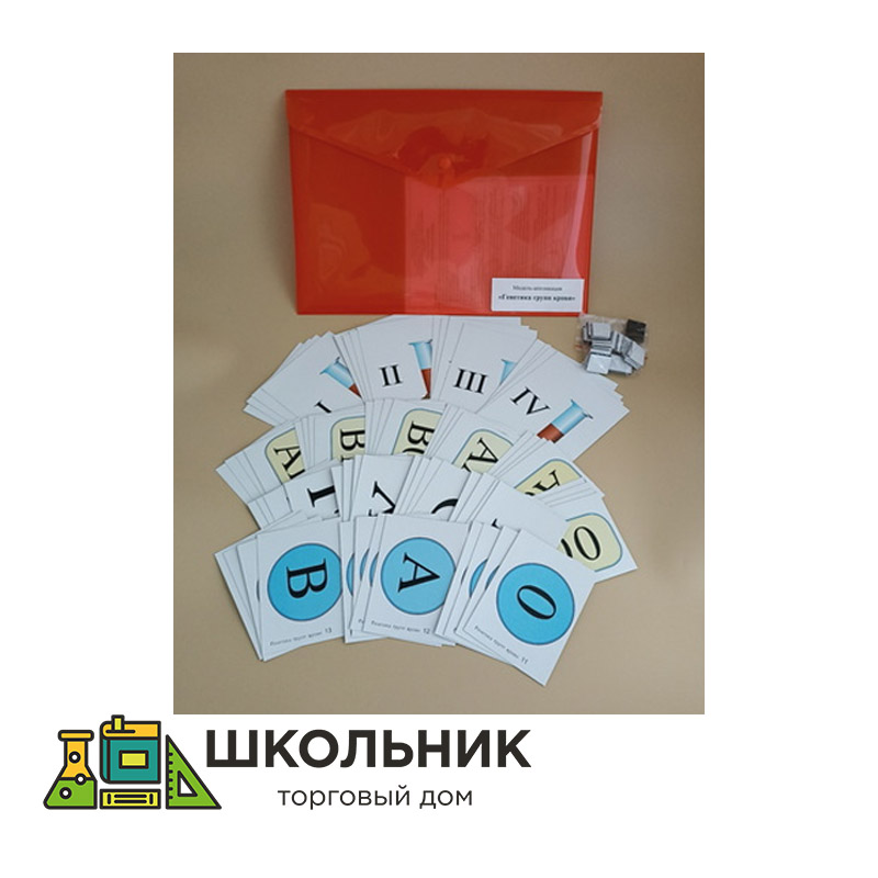 Пособие состоит из 68 карточек, напечатанных на картоне и ламинированных матовой (антибликовой) пленкой. На карточках представлено изображение различных групп крови, генотипов групп крови, гамет и генетических символов. Пособие снабжено магнитным креплением, что позволяет монтировать схемы на магнитной доске. Перед началом работы с пособием на карточки нужно наклеить магнитную резину, предварительно сняв с неё защитную плёнку. Модель-аппликация упакована в папку-конверт на кнопке.