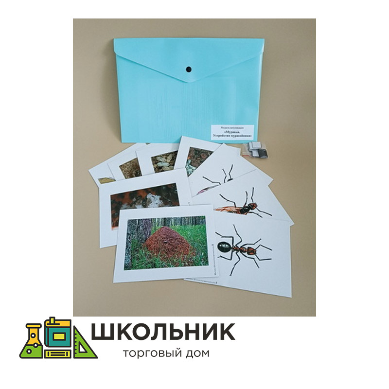 Пособие состоит из 9 карточек, напечатанных на картоне и ламинированных матовой (антибликовой) пленкой. Карточки располагают на доске последовательно. На карточках 1-3 представлены стадии развития муравьев. На карточках 4-6 представлены особи, относящиеся к виду Рыжий лесной муравей, на карточках 7-9 показаны: жизнедеятельность муравьев, муравейник и схематическое изображение продольного разреза муравейника. Пособие снабжено магнитным креплением, что позволяет монтировать схемы на магнитной доске. Перед началом работы с пособием, на карточки нужно наклеить магнитную резину, предварительно сняв с неё защитную плёнку. Модель-аппликация упакована в папку-конверт на кнопке.