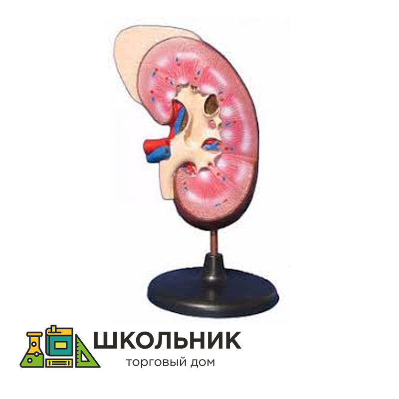 Модель неразборная, изготовлена из пластмассы, раскрашена в контрастные цвета и устанавливается на пластмассовую подставку. Модель отображает особенности внешнего и внутреннего строение почки человека, что позволяет рассмотреть следующие детали: 1. Капсула почки 5.Почечная артерия 2. Мозговое вещество 6. Почечная вена 3.Почечная лоханка 7 Корковый слой 4. Мочеточник 8. Надпочечник
