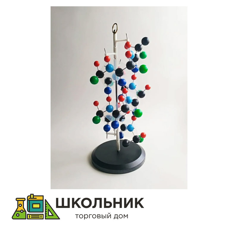 Атомы из которых строится белковая молекула (углерод, водород, азот, кислород), обозначены на модели разным цветом, также представлен участок пептида (аминокислоты) не принимающий участия в образовании химических связей в молекуле белка – радикал. Модель собрана на металлической оси с подставкой. Изделие упаковано в коробку с маркировкой.