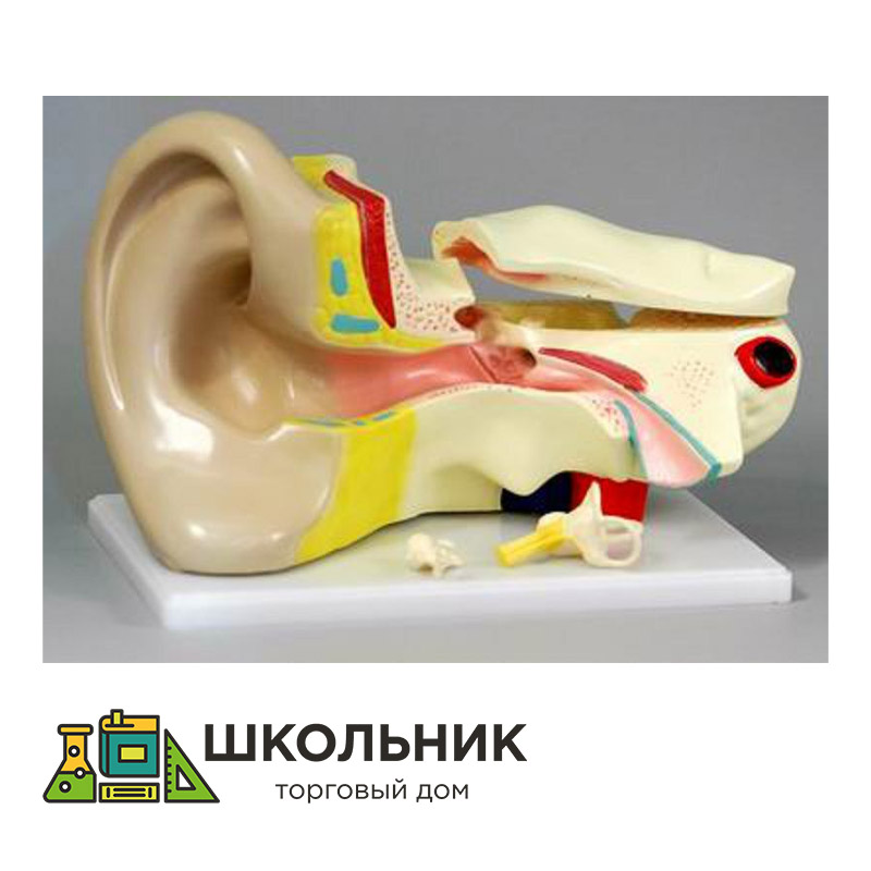 Увеличенная модель строения органа слуха человека, изготовлена из пластмассы, резины (отдельные части) и установлена на подставке. Модель раскрашена в контрастные цвета, разборная (состоит из четырех частей), что позволяет рассмотреть следующие детали внешнего и внутреннего строения: