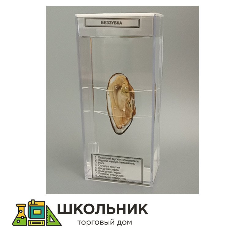 Препарат представляет собой пресноводного двухстворчатого моллюска, смонтированного на стеклянной пластине, которая помещена в сосуд с консервирующей жидкостью. Пластина закреплена в пазах сосуда и крышки. Сосуд герметично закрыт.