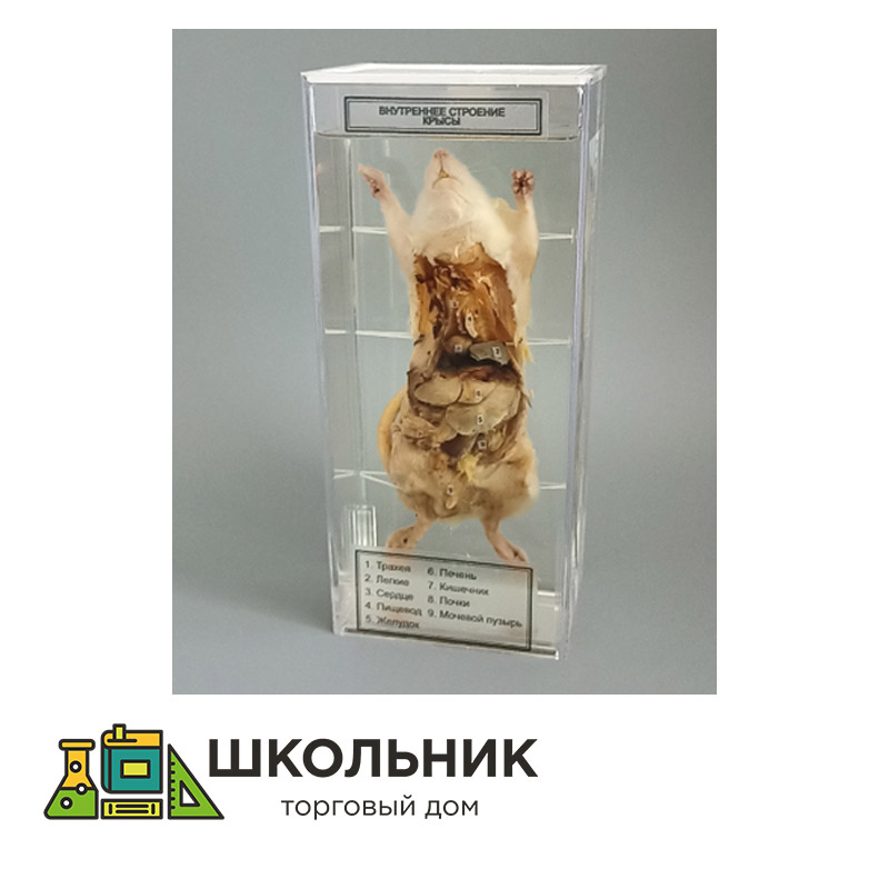 Препарат представляет собой крысу, вскрытую с брюшной стороны, смонтированную на стеклянной пластине, которая помещена в сосуд с консервирующей жидкостью. Пластина закреплена в пазах сосуда и крышки. Сосуд герметично закрыт.