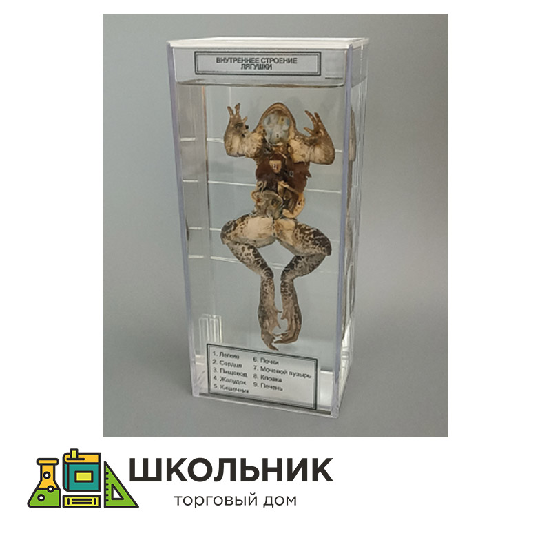 Препарат представляет собой лягушку, вскрытую с брюшной стороны, смонтированную на стеклянной пластине, которая помещена в сосуд с консервирующей жидкостью. Пластина закреплена в пазах сосуда и крышки. Сосуд герметично закрыт.