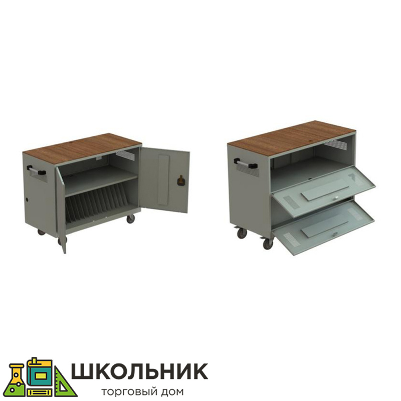 С лицевой стороны тележки расположены ячейки для ноутбуков и полка для проектора, с обратной стороны расположены полка для блоков питания ноутбуков и полка для сетевых фильтров. Имеет распашные запирающиеся двери, ригельная система запирания. Возможны вариации размеров как самого изделия, так и ячеек под ноутбук.