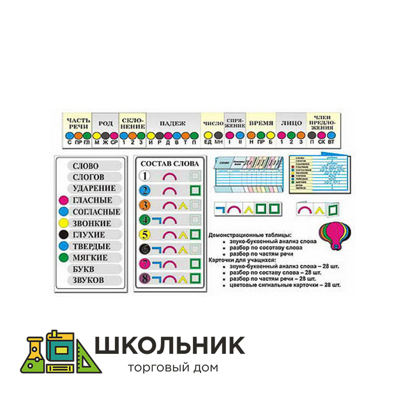 Карточки для учащихся по темам: "Звуко-буквенный анализ слова" - 28 шт., "Разбор по составу слова" - 28 шт., "Разбор по частям речи" - 28 шт., а также цветовые сигнальные карточки - 28 шт.